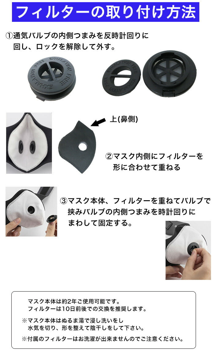 | 注意 | マスク本体は約2年ご使用可能です。フィルターは10日前後での交換を推奨します。 マスク本体はぬるま湯で浸し洗いをし、形を整えて陰干しをして下さい。 フィルターは洗濯できません。 |